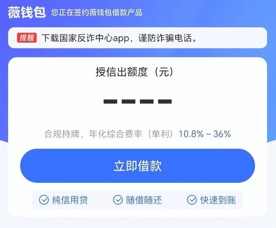 掀开薇钱包App,其首页写明“合规合手牌,年化抽象费率(单利)10.8%~36%”,不得不说薇钱包是一个“真诚东说念主”啊。