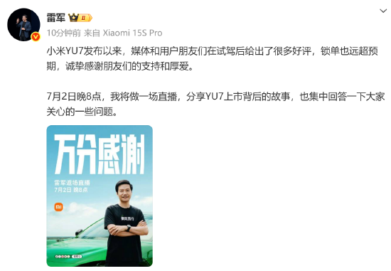 新浪科技讯 6月30日上昼音书九游体育娱乐网,小米集团董事长雷军发文称,小米YU7发布以来,媒体和用户一又友们在试驾后给出了许多好评,锁单也远超预期,将于7月2日晚8点作念一场直播,聚拢回复全球矜恤的一些问题。