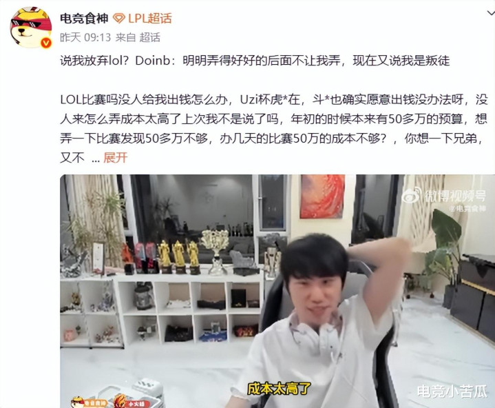 看到UZI杯如斯火爆,归正Doinb是保重了,看到弹幕说我方怎样不去插足UZI杯的时辰,Doinb笑了,暗示我方怎样去?另外,亦然说出了不少心声。按照Doinb的说法,我方不是不思举办赛事,主如果莫得平台维持啊,莫得钱,怎样举办,年前说唯有50万,本钱皆不够,办不起来了。