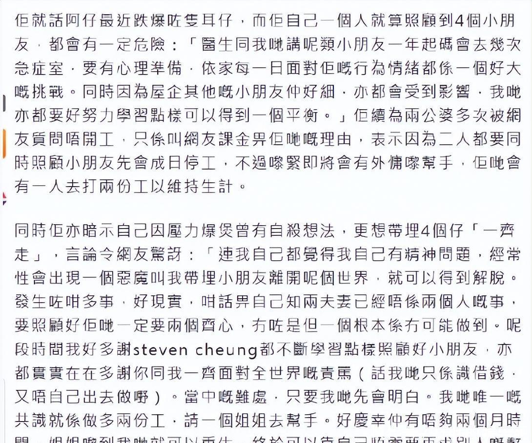 2024年2月份,张致恒太太雯雯就在酬酢平台上晒出了长文,公开显现了生活压力大,女儿还患有自闭症,称我方不啻一次思要带着4个孩子沿途轻生。