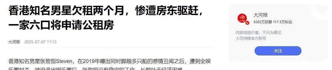 更离谱的是,这两年来,张致恒竟然把手伸向了粉丝,自曝收入仅够糊口,并开动了向粉丝要钱,甚而在7月2日,还有港媒报谈称,张致恒一家堕入了租务辛苦,在“霸租”两个月后,被房主给“赶”出了家门。