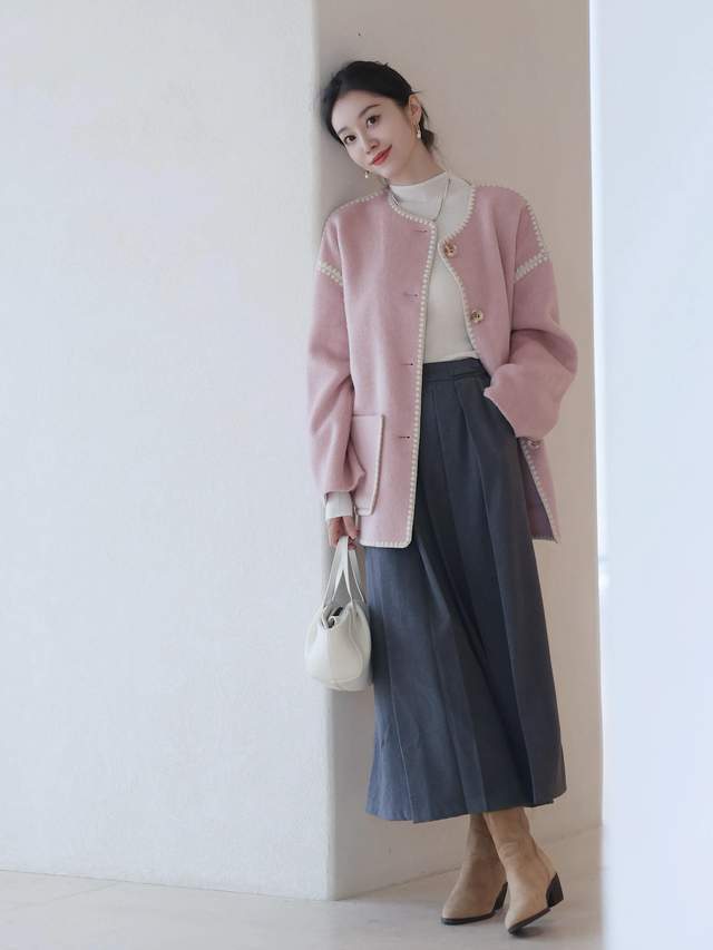 小香风外衣天生就领有一种紧密的兴盛气质,举例上头就用了一件粉色的小香风外衣,内搭白色针织毛衣和一条最为从简的灰色压褶半身裙组合,脚上穿了地面色的中筒靴,这种打扮时势不光能修饰肤色,显白显嫩,还能让你显高又显瘦。