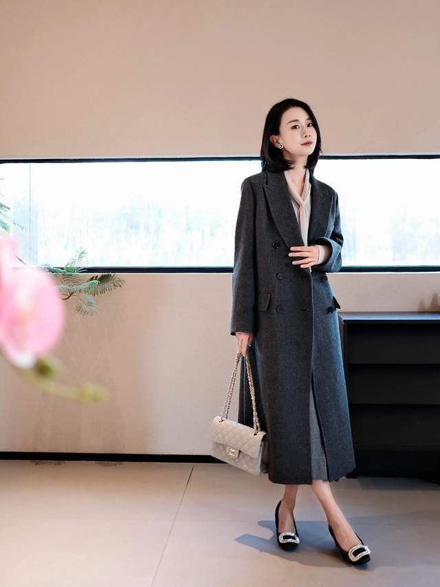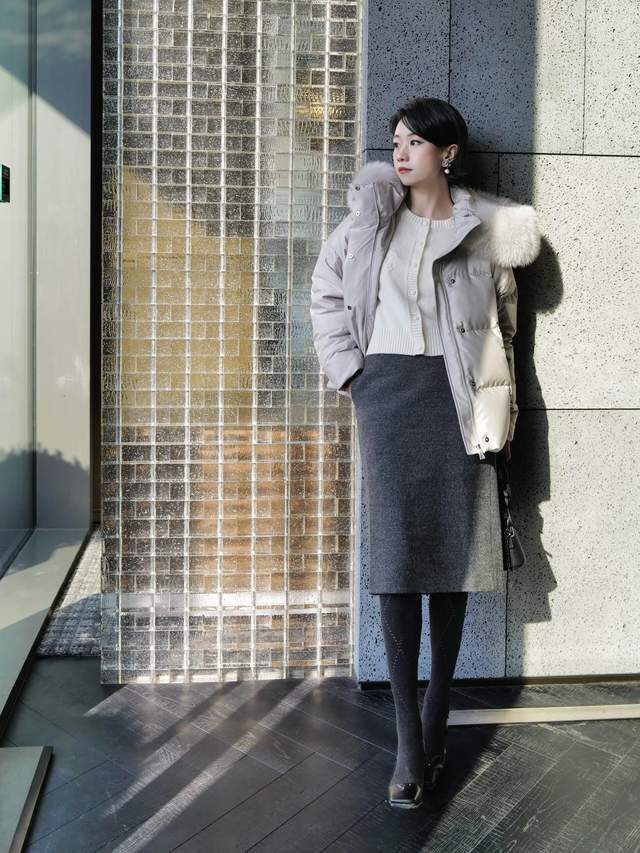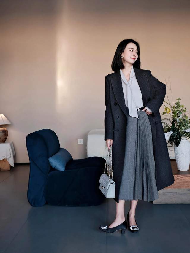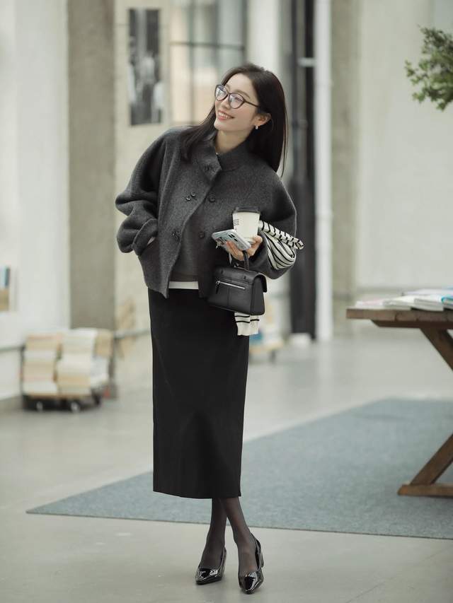 裙长过膝不外脚踝,这么的半身裙穿在身上照实更多礼大方。关于职场女性来说,十足可以像上头这位前锋达东谈主一样,用灰色的半身裙内搭一件粉色的打底衫和一件翻领的灰色大衣外衣,脚上踩着一对玄色的浅口单鞋,就能使得穿搭者既优雅又干练。