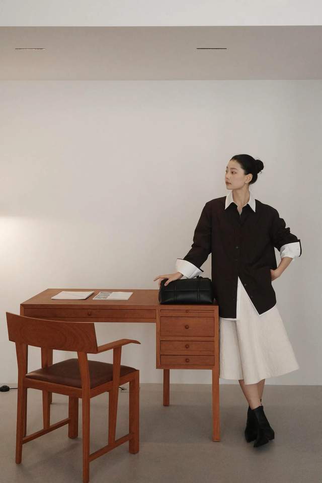 也不是说穿上一条裙子就使得我方变得优雅大方,亦然需要一些色调的搭配手段的,比如说你遴荐一条白色的散装半身裙,这本事你可能会思到用白色衬衫顺利搭配就可以,然则这么会过于单调,咱们可以学习上头这位前锋博主一样,再叠穿一件棕色的衬衫,造成一个撞色的成果,档次感会更分明。
