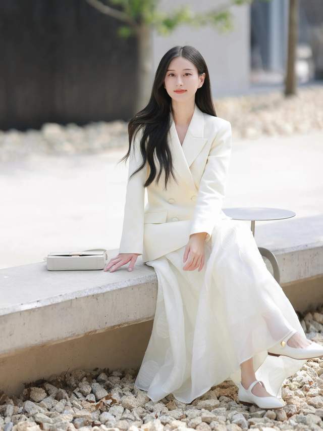 比如第一位前锋博主就遴荐了一件白色的西装外衣,搭配上白色的散装半身裙,脚上踩了一对白色的玛丽真鞋,这么的打扮更容易塑造出干练优雅的气质感。