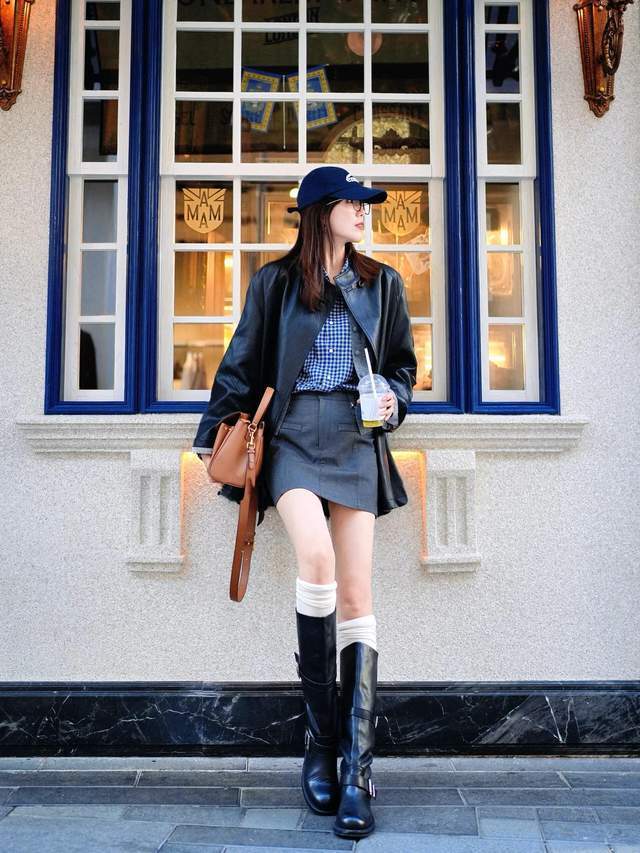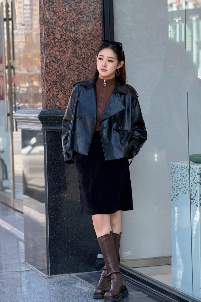 要是全身是玄色的穿着,照实有本事会过于千里闷,这个本事咱们可以加上暖色系的单品,举例上头这位博主,用玄色皮衣外衣搭配上藏蓝色的直筒半身裙,为了能让举座造型色调不千里闷败兴,是以用棕色的毛衣和棕色的中筒靴来组合,一忽儿点亮了举座造型的配色。
