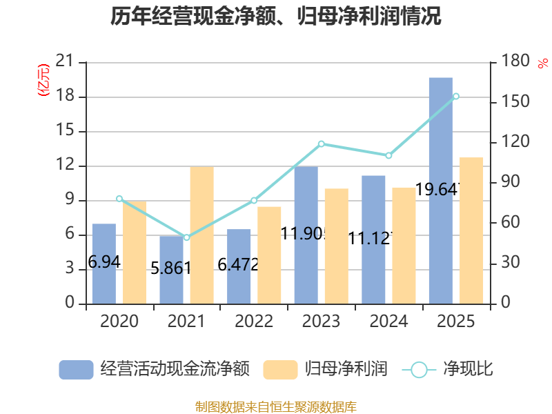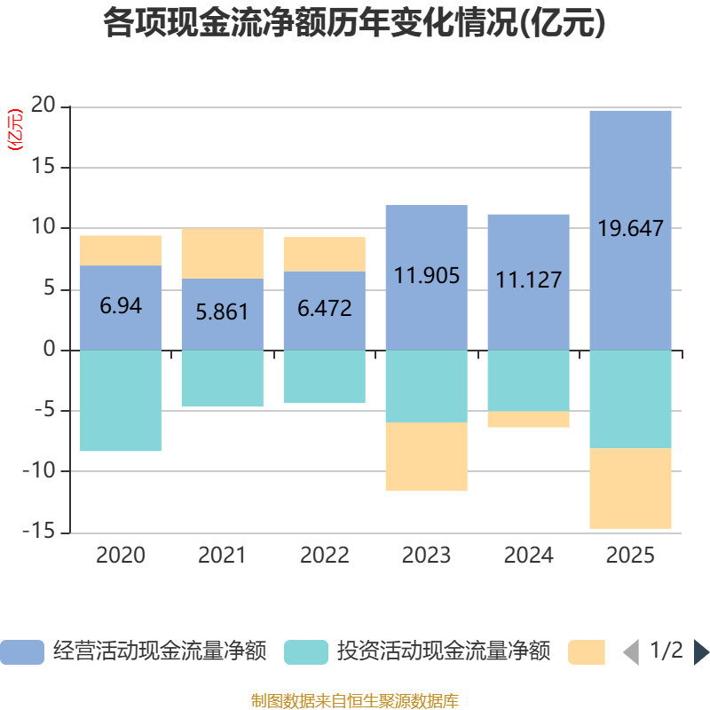 适度2025年,公司诡计举止现款流净额为19.65亿元,同比增长76.58%;筹资举止现款流净额-6.61亿元,同比减少5.3亿元;投资举止现款流净额-8.09亿元,上年同时为-5.05亿元。
