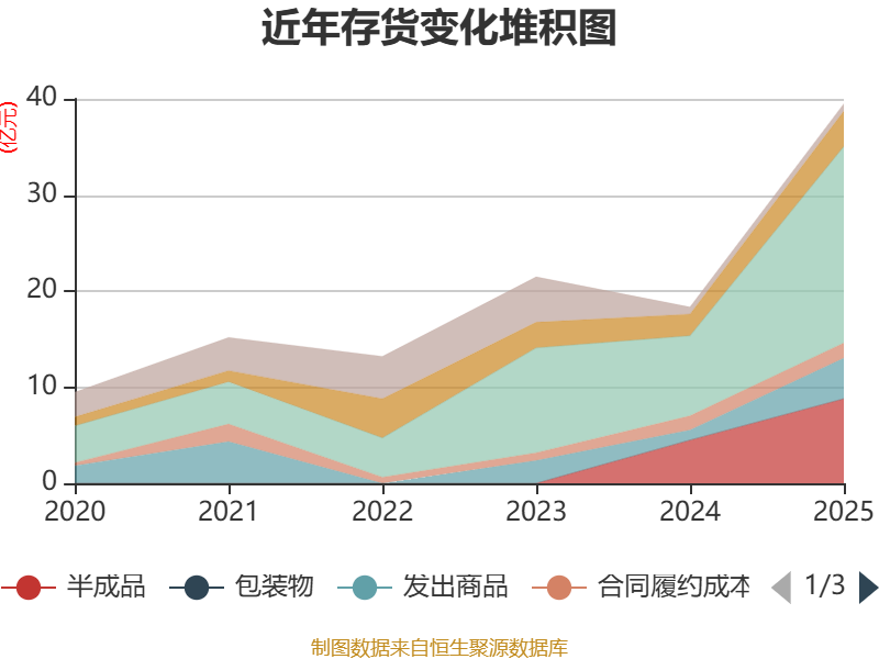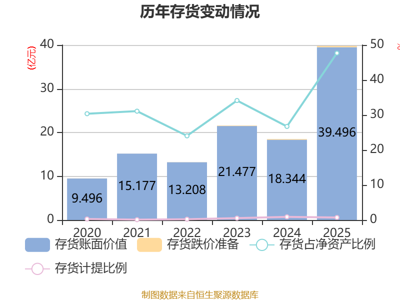从存货变动来看,适度2025年末,公司存货账面价值为39.5亿元,占净钞票的47.68%,较上年末增多21.15亿元。其中,存货跌价准备为2879.82万元,计提比例为0.72%。